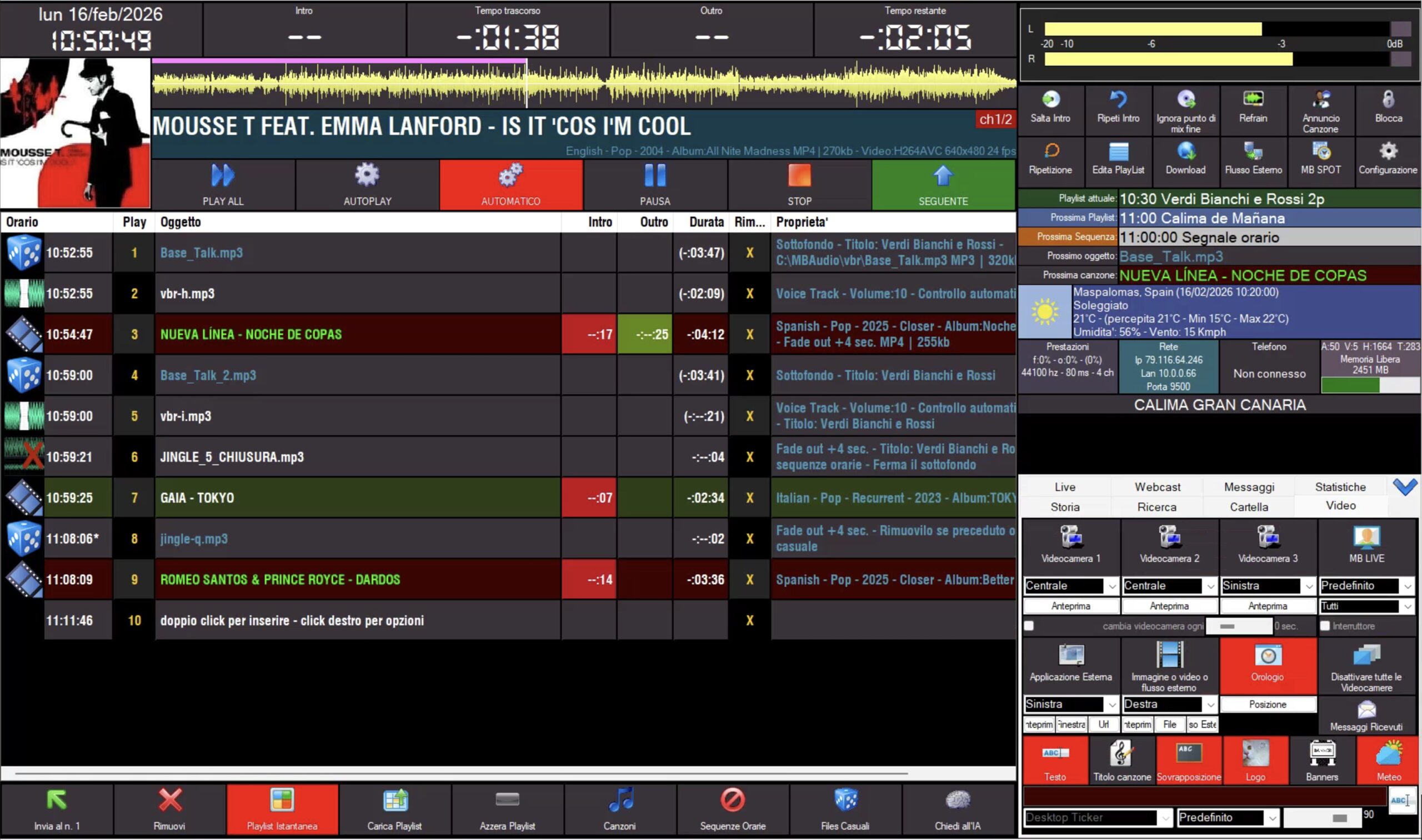 Tutta la tua radio in un unico software MBStudio è la soluzione "all-in-one" per l'automazione audio e video. Regia automatica, gestione archivio musicale, streaming integrato e funzioni live: tutto ciò che serve per trasmettere in modo professionale, 24/7, senza compromessi. Puoi pianificare con precisione rotazioni musicali, rubriche e pubblicità, semplificando la gestione del palinsesto. La sua interfaccia intuitiva ti permette inoltre di gestire facilmente collegamenti esterni e Visual Radio, garantendo massima stabilità per ogni tipo di emittente.