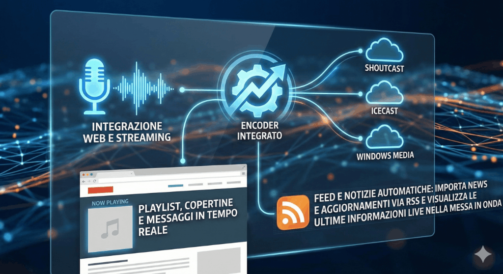 - Feed e notizie automatiche: Importa news e aggiornamenti via RSS e visualizza le ultime informazioni live nella messa in onda.